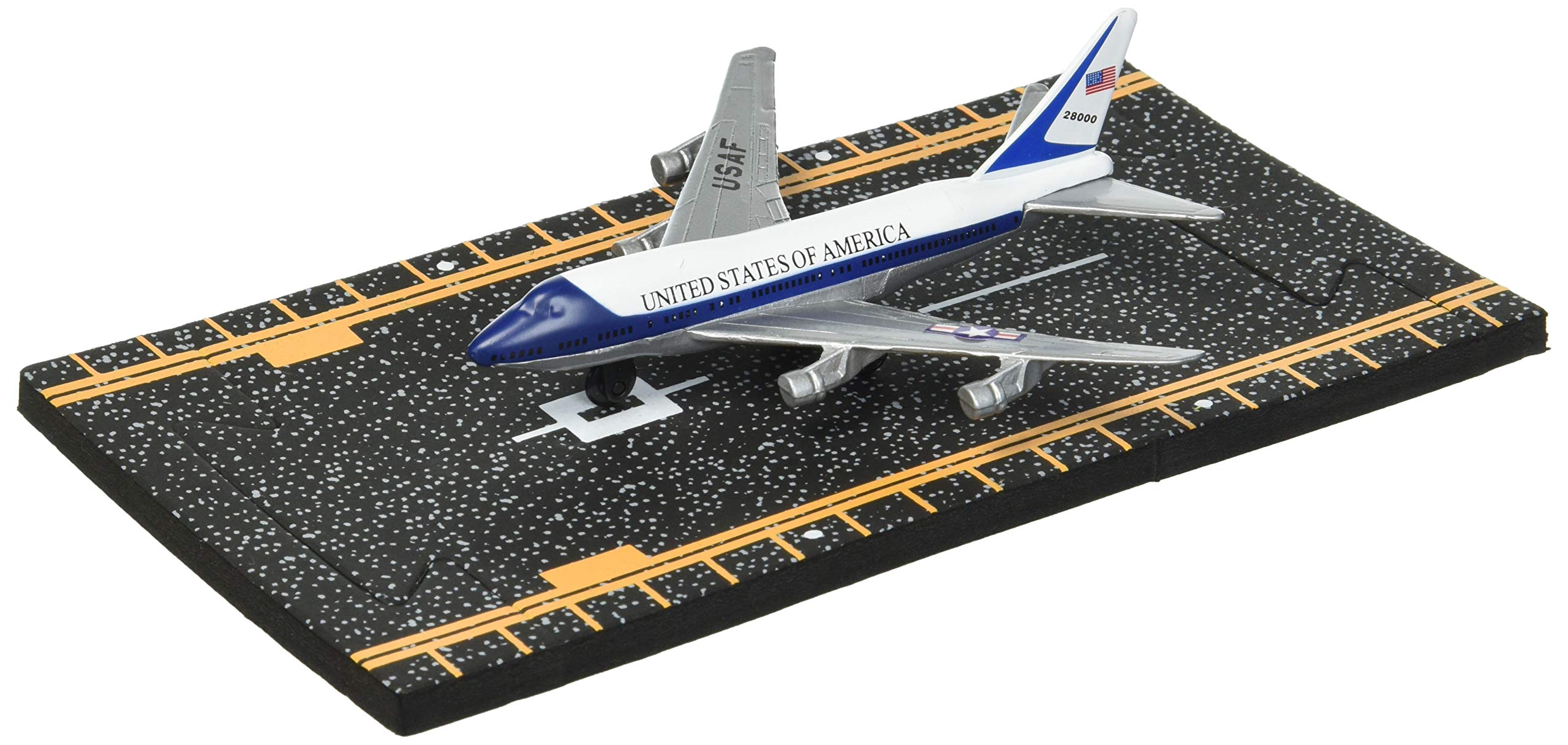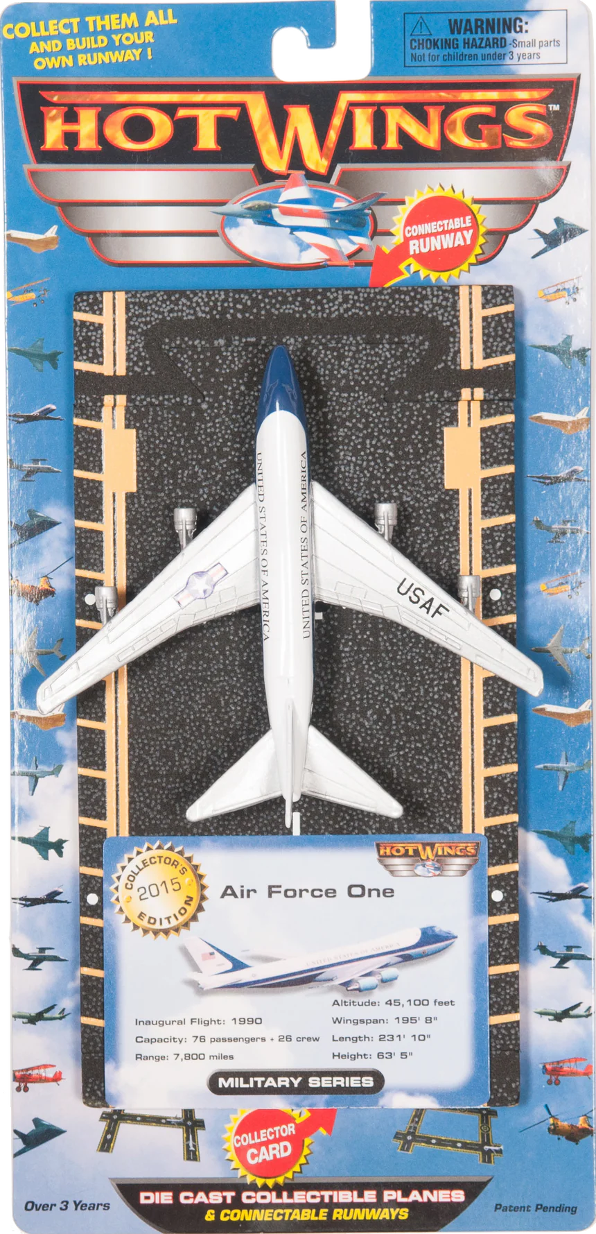 Command the skies with the Hot Wings Air Force One from the Military Series. This die-cast model represents the iconic presidential aircraft and comes with a fact-filled collector card.