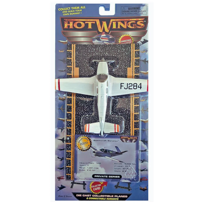 Take to the skies with the Hot Wings Beechcraft Bonanza from the Private Series. This die-cast model showcases the classic single-engine design and includes a fact-filled collector card.