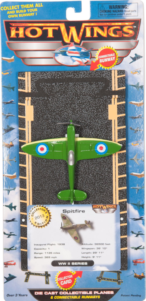 Relive the Battle of Britain with the Hot Wings Spitfire from the WWII Series. This die-cast model features authentic RAF markings and comes with a fact-filled collector card.