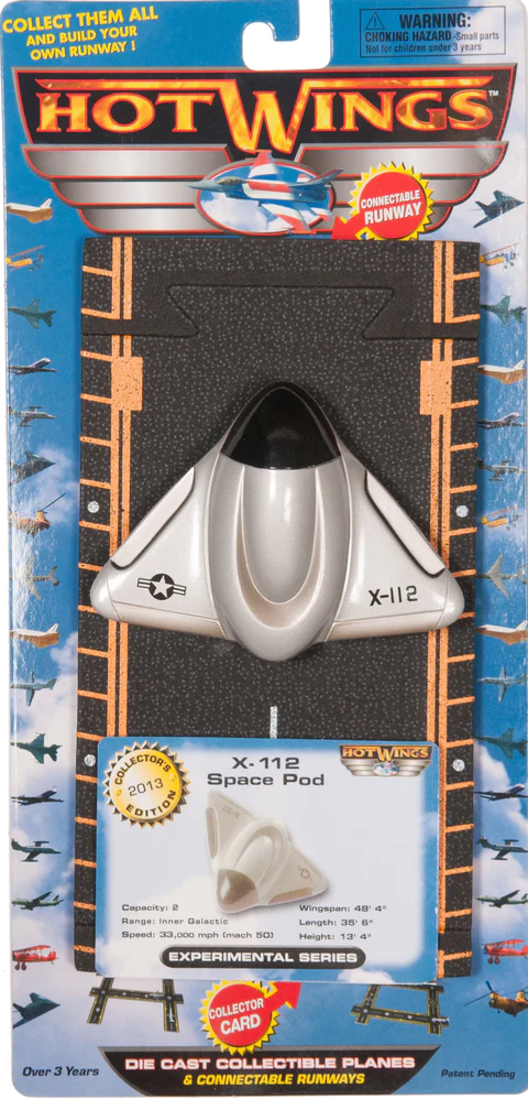 Take flight into the future with the Hot Wings X-112 Space Pod from the Experimental Series. This die-cast model features sleek, futuristic styling and comes with a fact-filled collector card.
